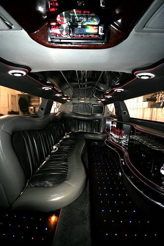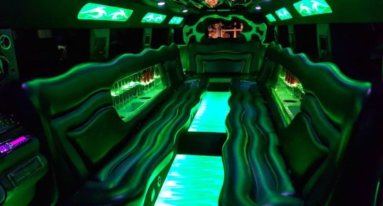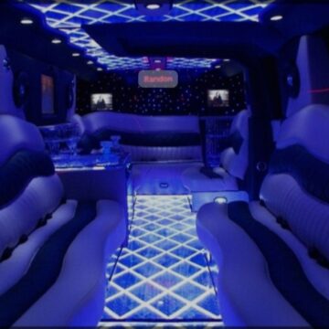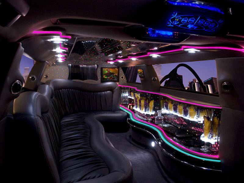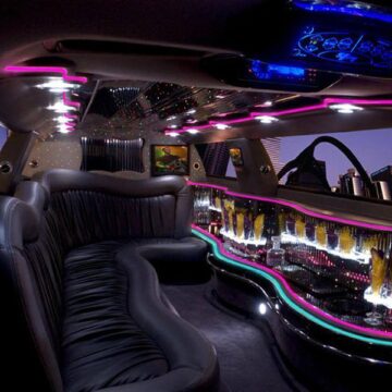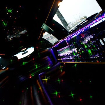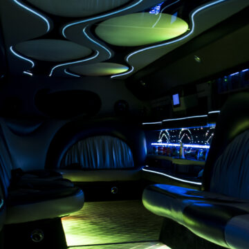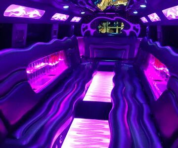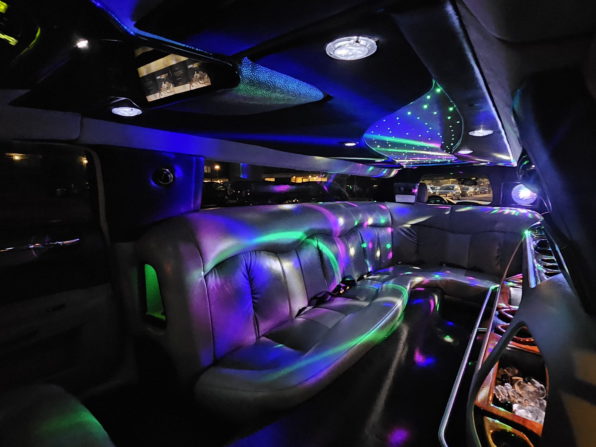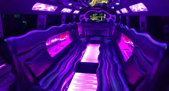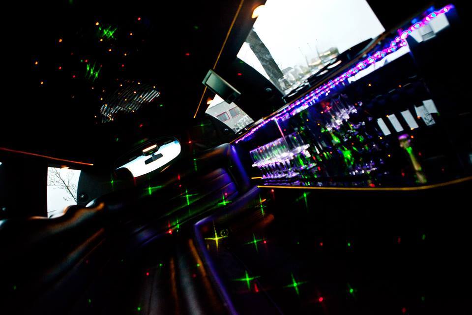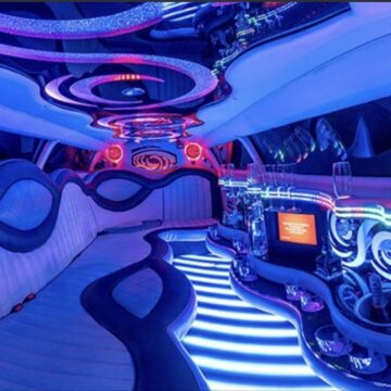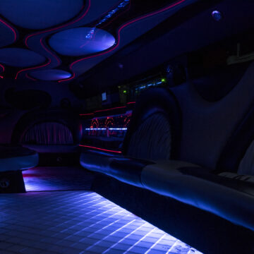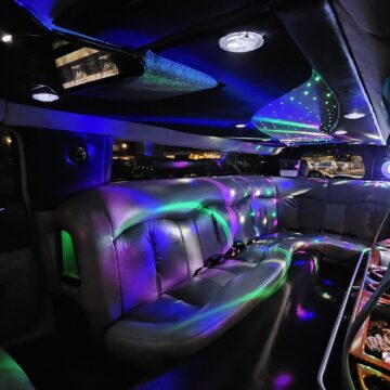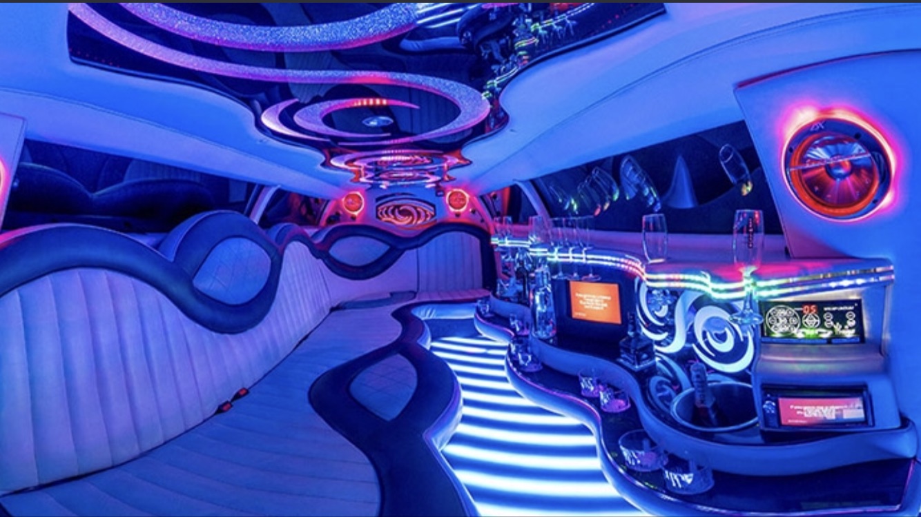 Een feestelijke limousine met sfeerverlichting en luxe interieur.