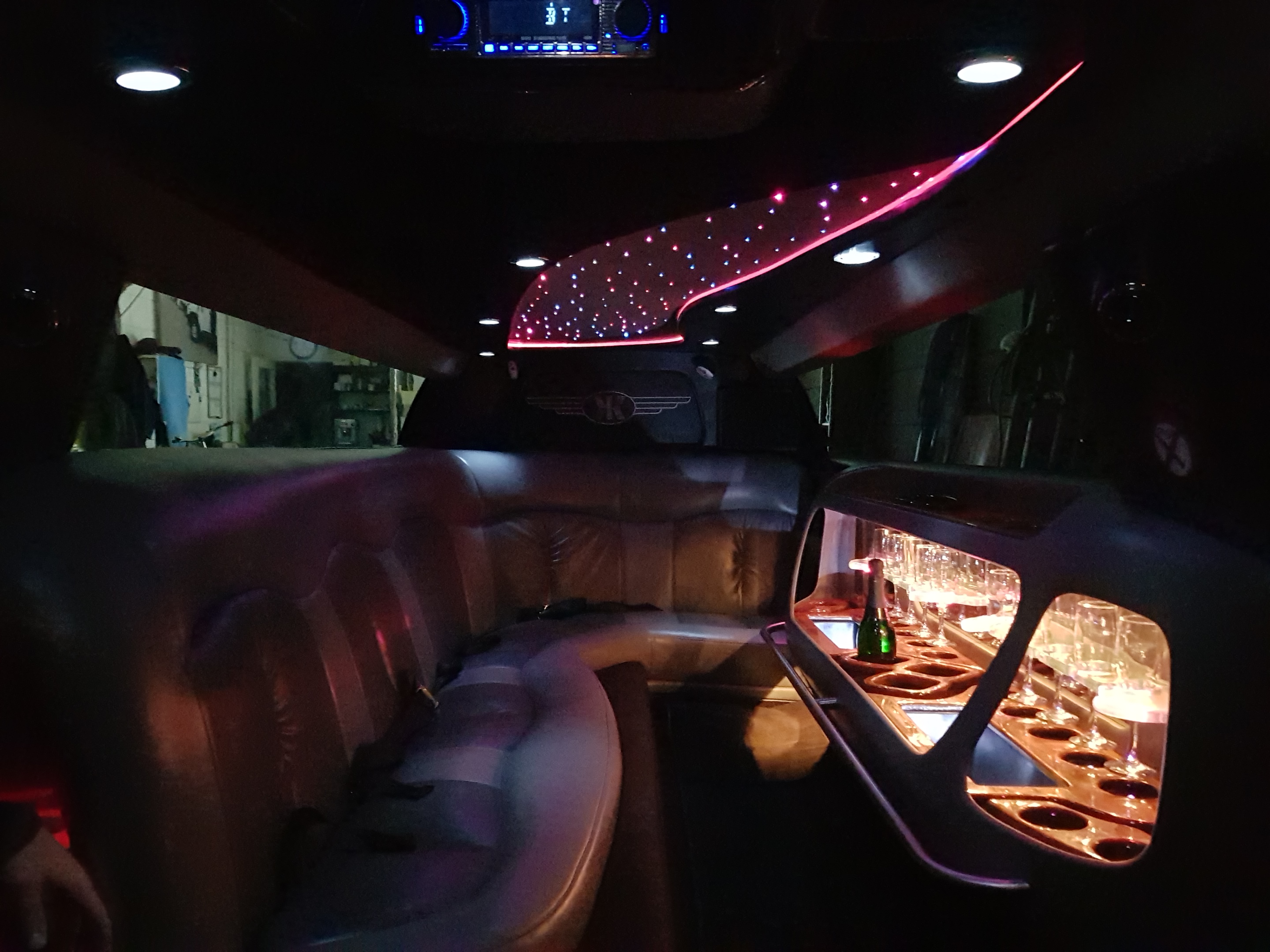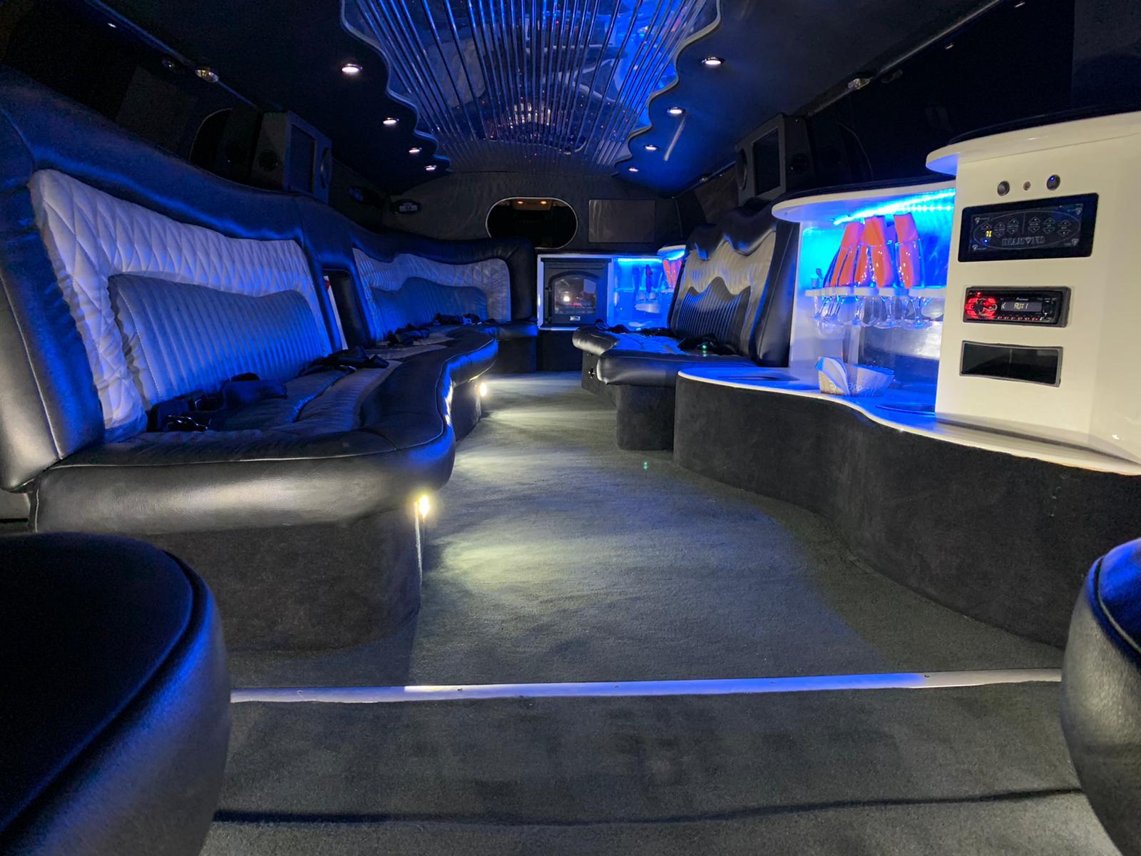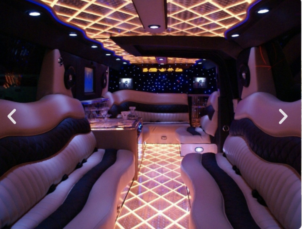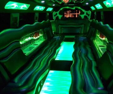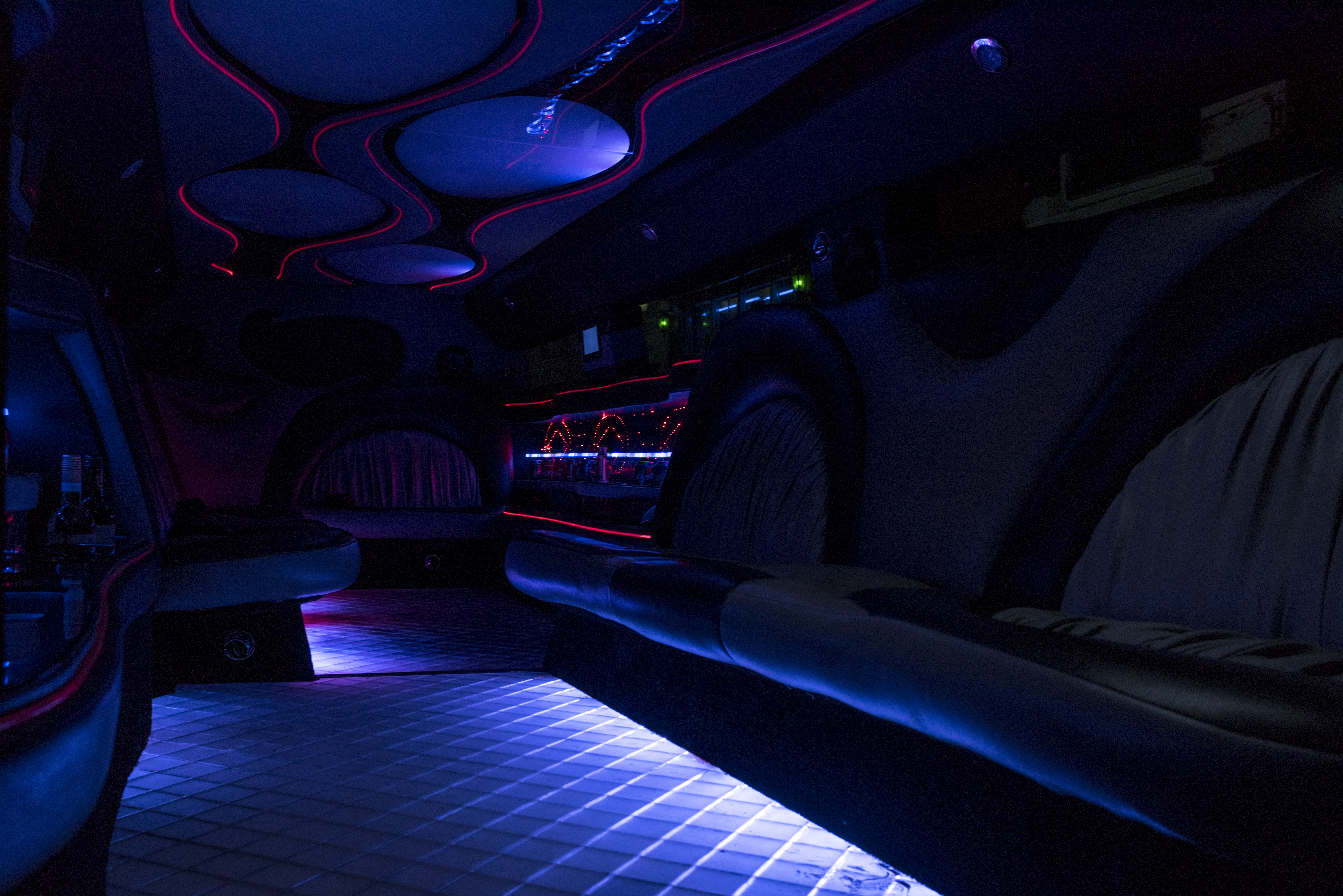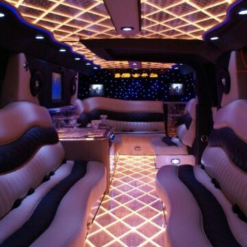 Een feestelijke limousine met sfeerverlichting en luxe interieur.