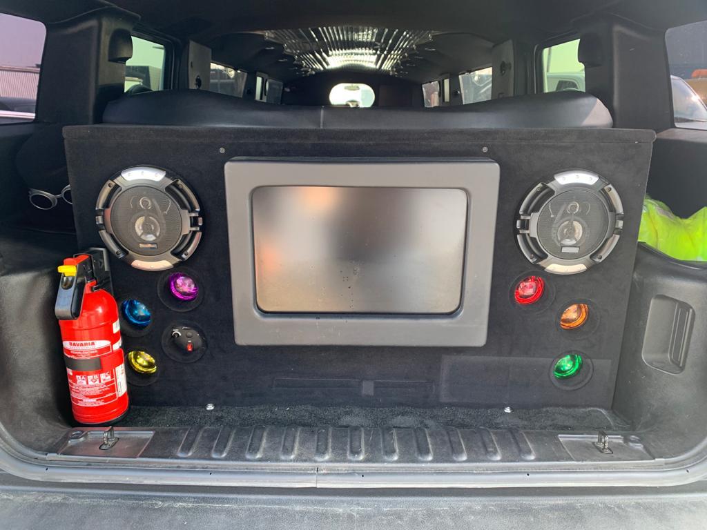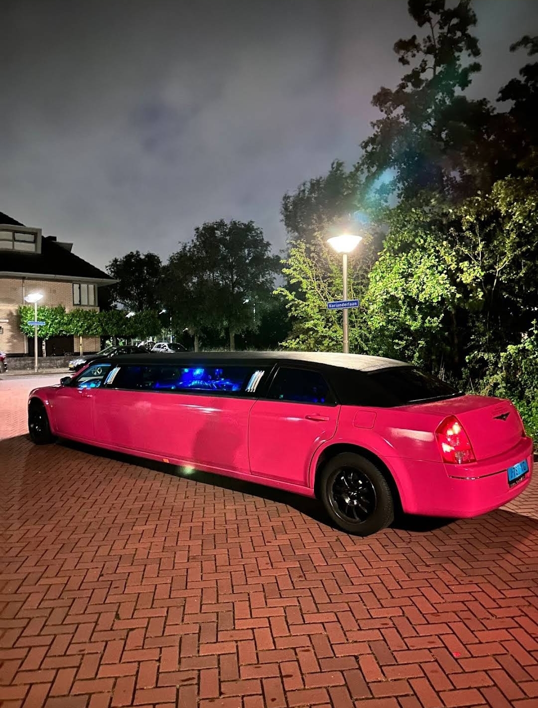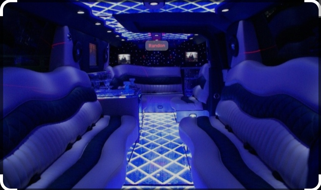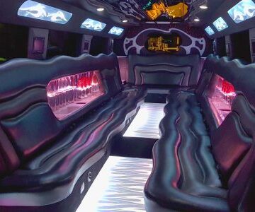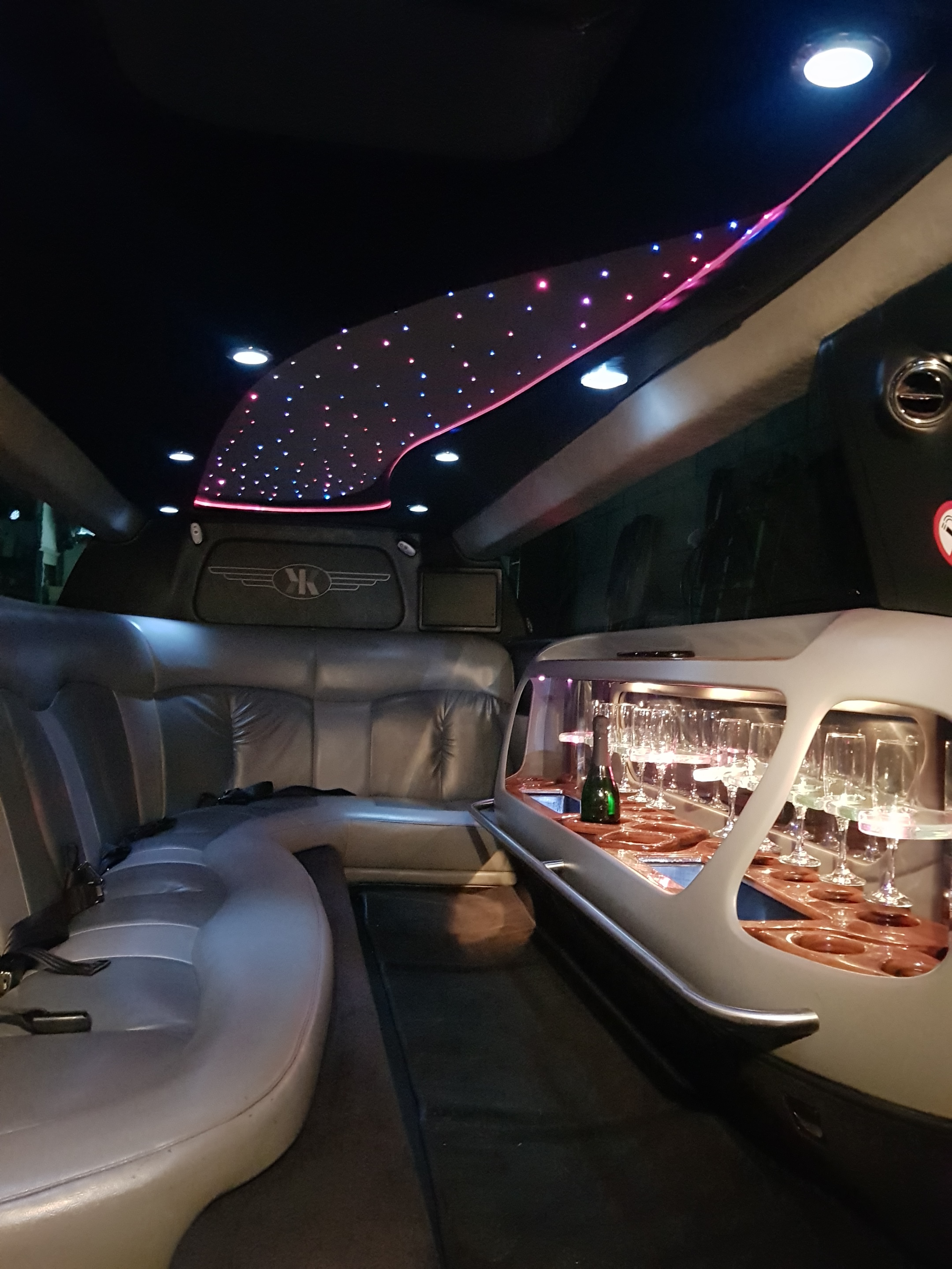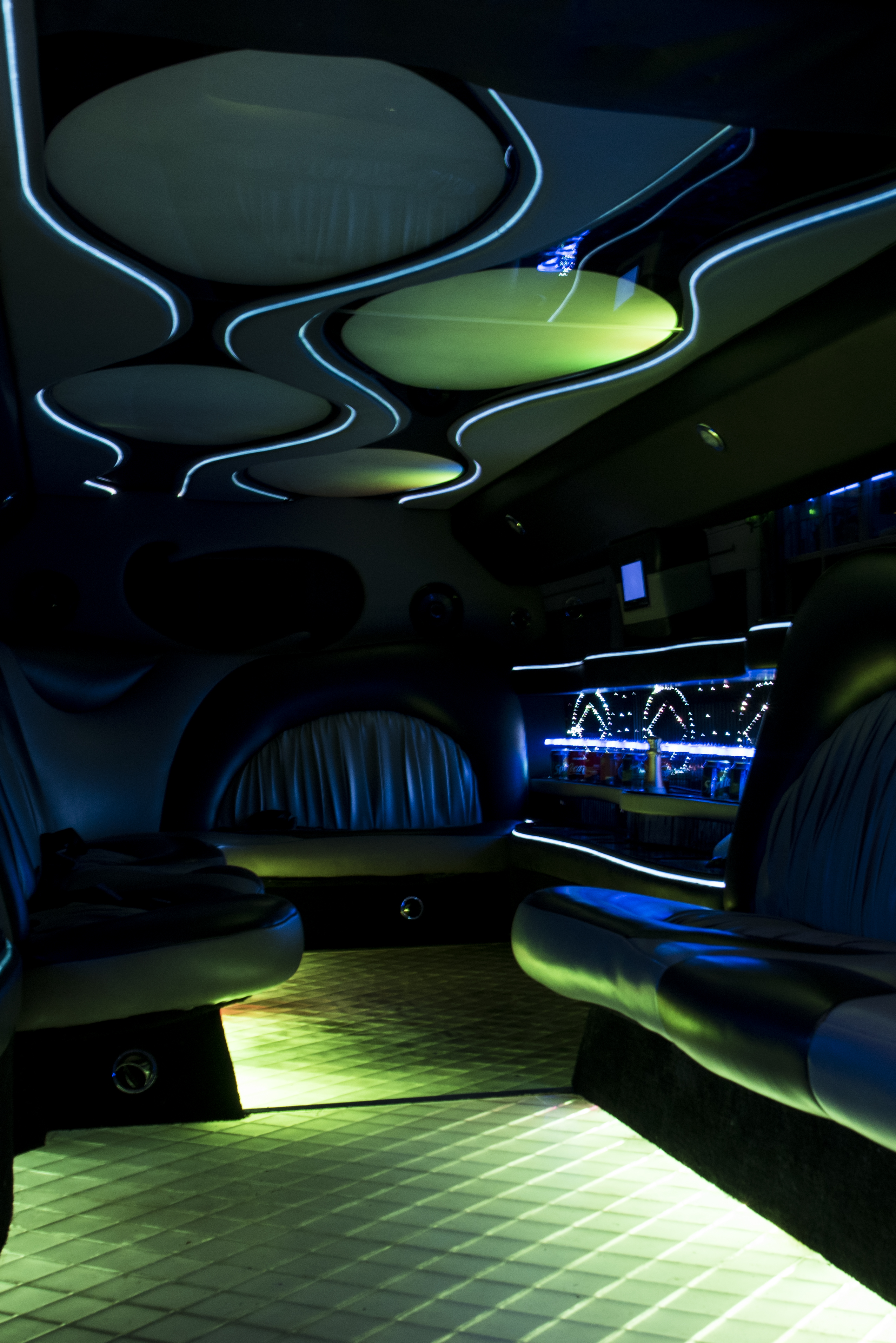 Een feestelijke limousine met sfeerverlichting en luxe interieur.